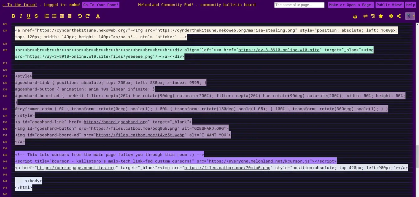 Here is an example of one of the pages: a community bulletin board. In the top right corner, if you're logged in to Melonland, you can click "Edit this Page" and will bring up the code as shown below.