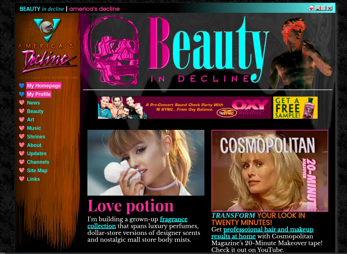 She tells you immediately it's a "queer" and "feminist" site but as you're browsing around, the first impression doesn't match the stereotype. Mostly you're being bombarded by visual nostalgia, graphic design, and varied magazine and AOL inspired layouts on every page.